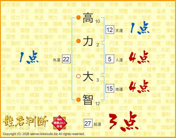 あなたの人生を表す1番重要な運勢です。生涯を通じて影響する総合運となり、主に50歳以降の晩年期に影響を及ぼします。苗字と名前の合計画数。