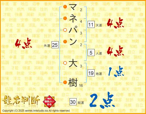 マ(2画)ネ(4画)パ(3画)ン(2画)  大(3画)樹(16画)