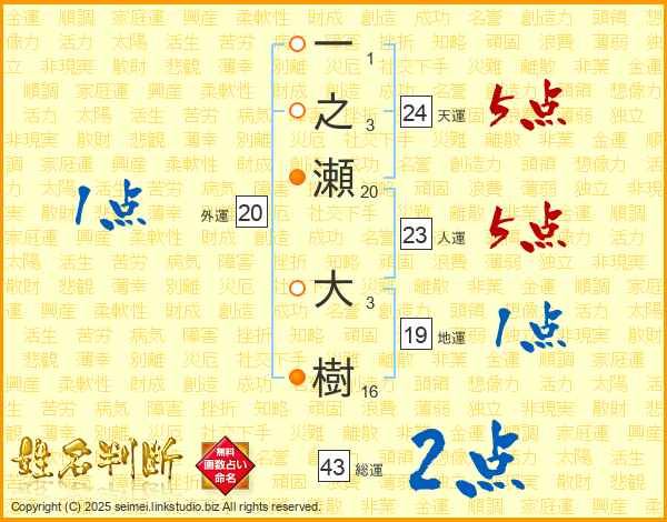 一(1画)之(3画)瀬(20画) 大(3画)樹(16画)