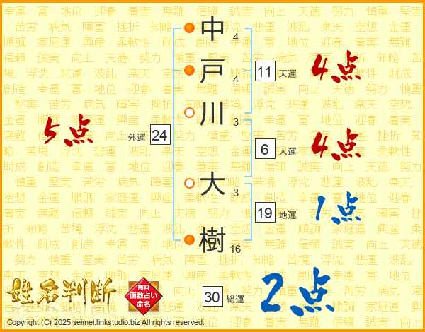 中(4画)戸(4画)川(3画) 大(3画)樹(16画)