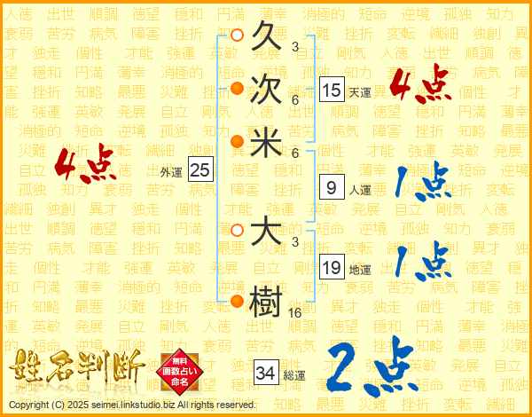 久(3画)次(6画)米(6画) 大(3画)樹(16画)