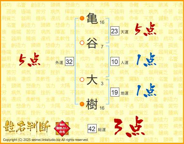 亀(16画)谷(7画) 大(3画)樹(16画)
