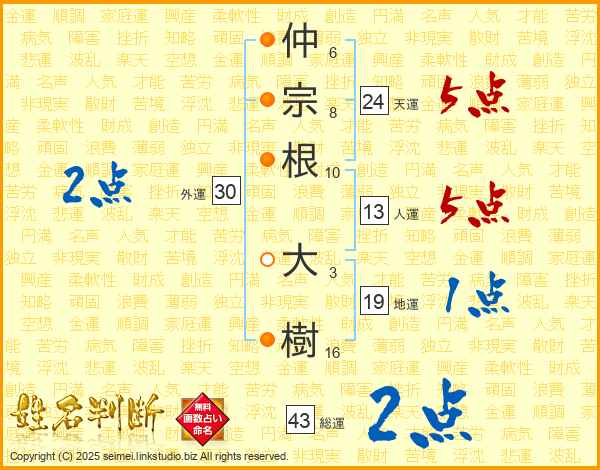 仲(6画)宗(8画)根(10画) 大(3画)樹(16画)