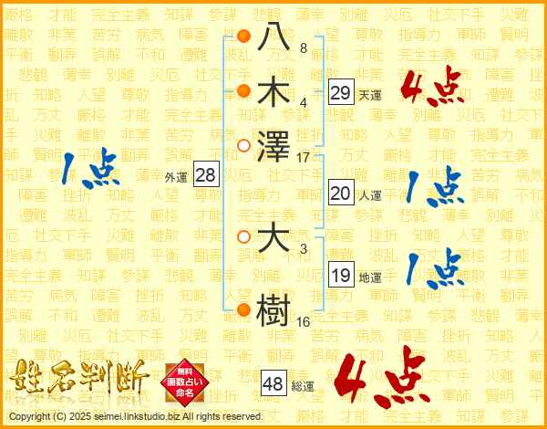 八(8画)木(4画)澤(17画) 大(3画)樹(16画)