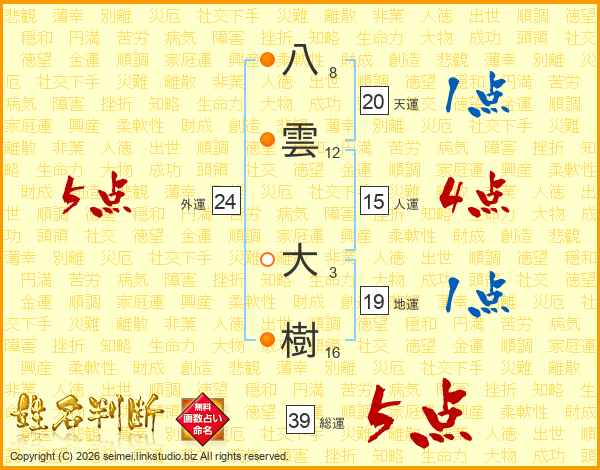 八雲大樹さんの総運は39画の5点!