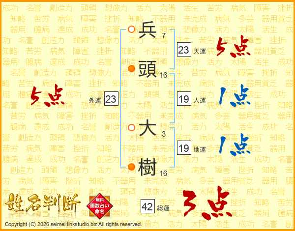 兵(7画)頭(16画) 大(3画)樹(16画)