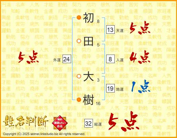 あなたの人生を表す1番重要な運勢です。生涯を通じて影響する総合運となり、主に50歳以降の晩年期に影響を及ぼします。苗字と名前の合計画数。