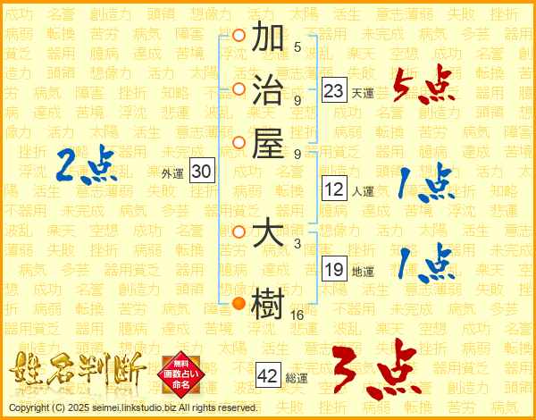 加(5画)治(9画)屋(9画) 大(3画)樹(16画)