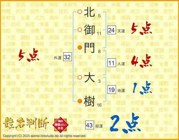 北(5画)御(11画)門(8画) 大(3画)樹(16画)