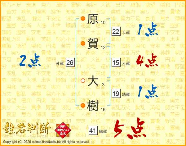 原(10画)賀(12画) 大(3画)樹(16画)