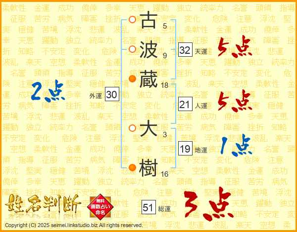 古(5画)波(9画)蔵(18画) 大(3画)樹(16画)