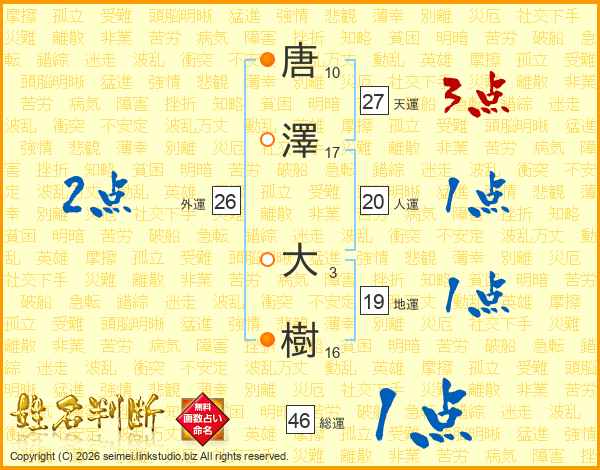 唐(10画)澤(17画) 大(3画)樹(16画)