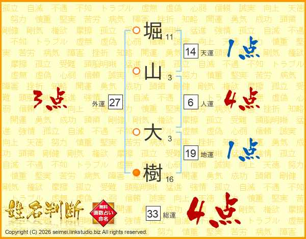 生活面を象徴する運勢です。外部から受ける影響力を表し、結婚運、家庭運や職場、環境への順応性を表します。総運から人運を引いた画数。姓や名が1文字の場合を除く。
