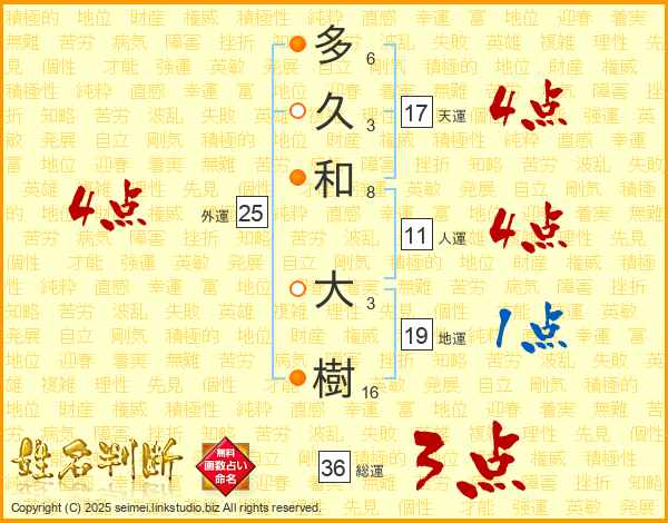 多(6画)久(3画)和(8画) 大(3画)樹(16画)