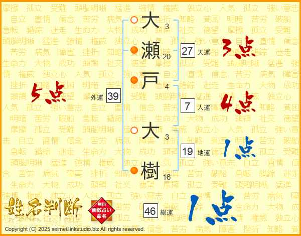 大(3画)瀬(20画)戸(4画) 大(3画)樹(16画)