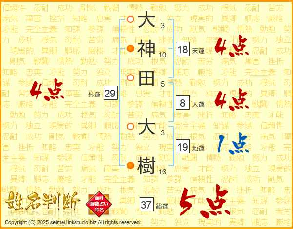 大(3画)神(10画)田(5画) 大(3画)樹(16画)