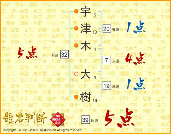 宇(6画)津(10画)木(4画) 大(3画)樹(16画)