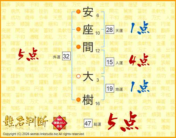 安(6画)座(10画)間(12画) 大(3画)樹(16画)