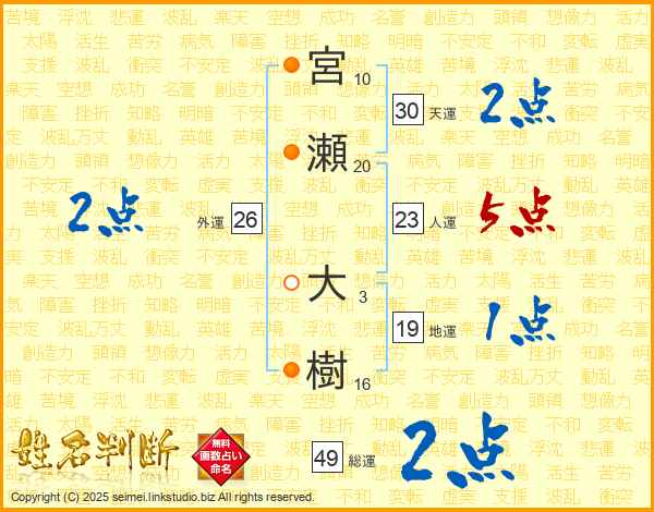 宮(10画)瀬(20画) 大(3画)樹(16画)