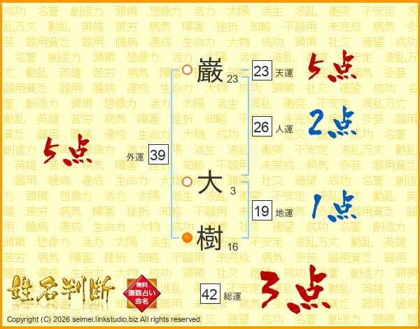 家系が持つ宿命的な運勢を表します。祖先から受け継いだ苗字ですので自分の力が及びません。家柄を象徴します。苗字の合計画数。