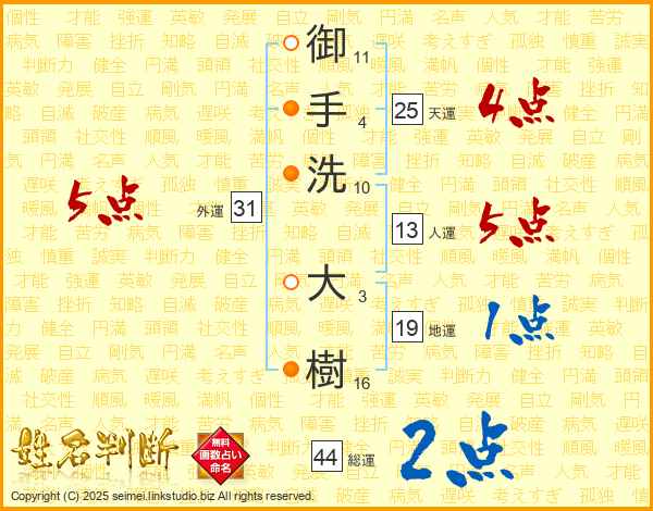御(11画)手(4画)洗(10画) 大(3画)樹(16画)