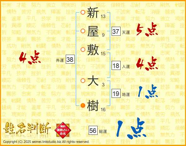 新屋敷大樹さんの天運は37画の5点!