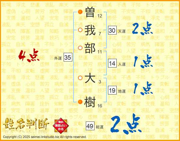 曽(12画)我(7画)部(11画) 大(3画)樹(16画)