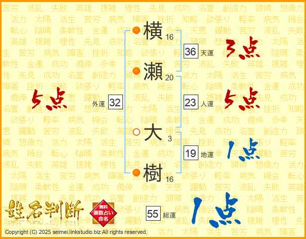 横(16画)瀬(20画) 大(3画)樹(16画)