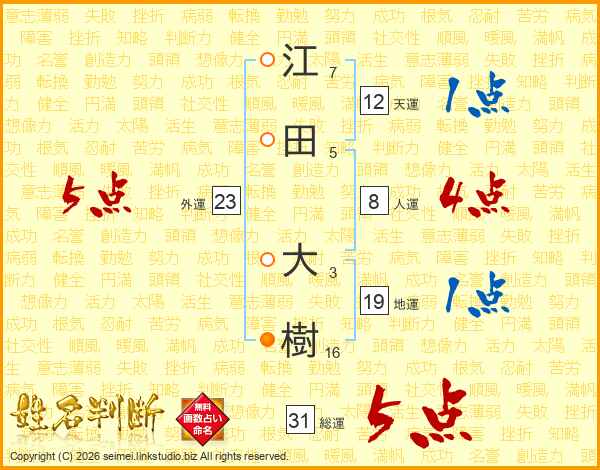 生活面を象徴する運勢です。外部から受ける影響力を表し、結婚運、家庭運や職場、環境への順応性を表します。総運から人運を引いた画数。姓や名が1文字の場合を除く。