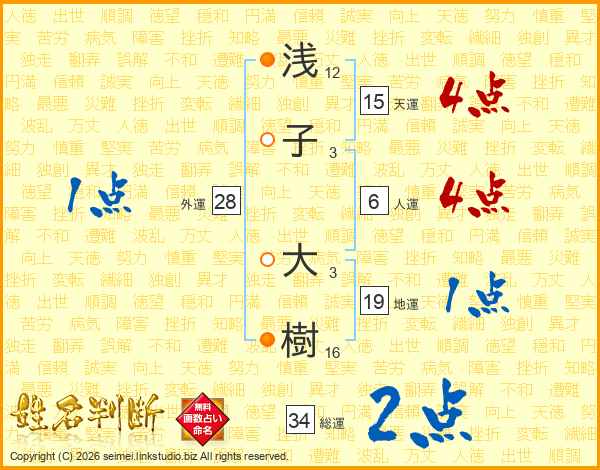 生活面を象徴する運勢です。外部から受ける影響力を表し、結婚運、家庭運や職場、環境への順応性を表します。総運から人運を引いた画数。姓や名が1文字の場合を除く。