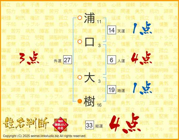 浦口大樹さんの総運は33画の4点!