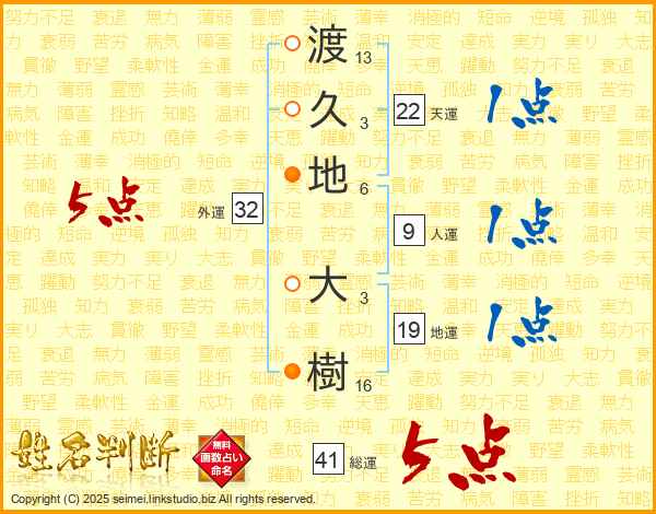 渡(13画)久(3画)地(6画) 大(3画)樹(16画)