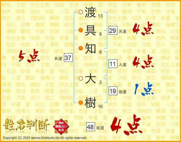 渡(13画)具(8画)知(8画) 大(3画)樹(16画)