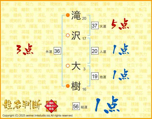 滝(20画)沢(17画) 大(3画)樹(16画)