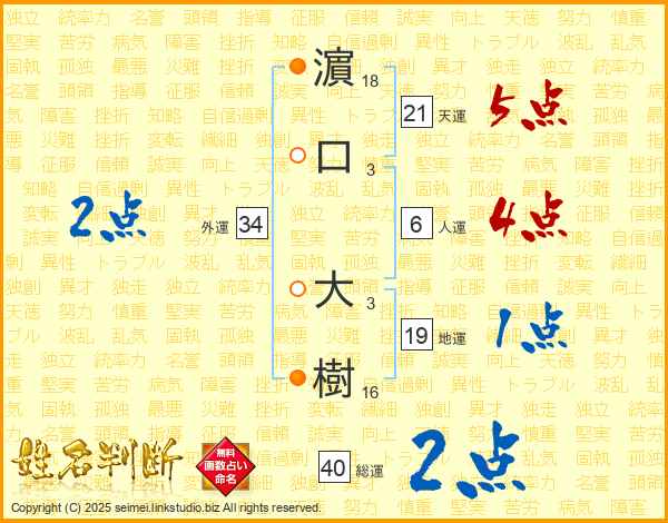 あなたの人生を表す1番重要な運勢です。生涯を通じて影響する総合運となり、主に50歳以降の晩年期に影響を及ぼします。苗字と名前の合計画数。
