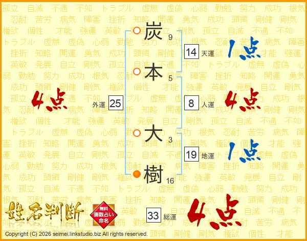 生活面を象徴する運勢です。外部から受ける影響力を表し、結婚運、家庭運や職場、環境への順応性を表します。総運から人運を引いた画数。姓や名が1文字の場合を除く。