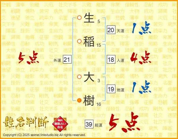 あなたの人生を表す1番重要な運勢です。生涯を通じて影響する総合運となり、主に50歳以降の晩年期に影響を及ぼします。苗字と名前の合計画数。