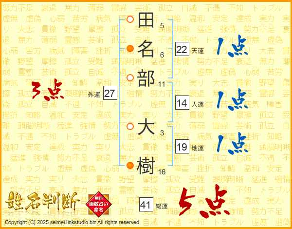 田(5画)名(6画)部(11画) 大(3画)樹(16画)