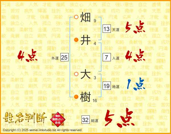 あなたの人生を表す1番重要な運勢です。生涯を通じて影響する総合運となり、主に50歳以降の晩年期に影響を及ぼします。苗字と名前の合計画数。