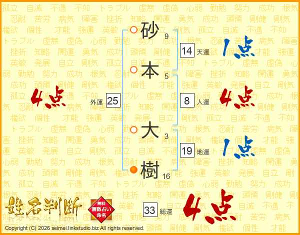 生活面を象徴する運勢です。外部から受ける影響力を表し、結婚運、家庭運や職場、環境への順応性を表します。総運から人運を引いた画数。姓や名が1文字の場合を除く。