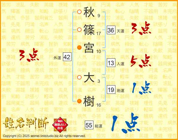 秋(9画)篠(17画)宮(10画) 大(3画)樹(16画)