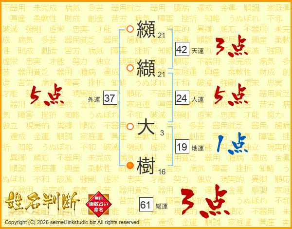 生活面を象徴する運勢です。外部から受ける影響力を表し、結婚運、家庭運や職場、環境への順応性を表します。総運から人運を引いた画数。姓や名が1文字の場合を除く。