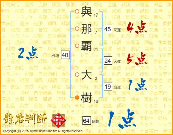 與(17画)那(7画)覇(21画) 大(3画)樹(16画)