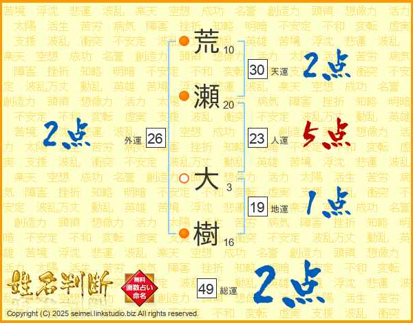 荒(10画)瀬(20画) 大(3画)樹(16画)