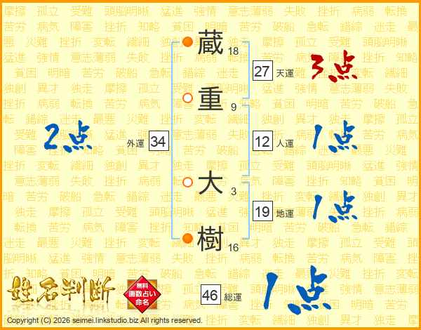 蔵(18画)重(9画) 大(3画)樹(16画)