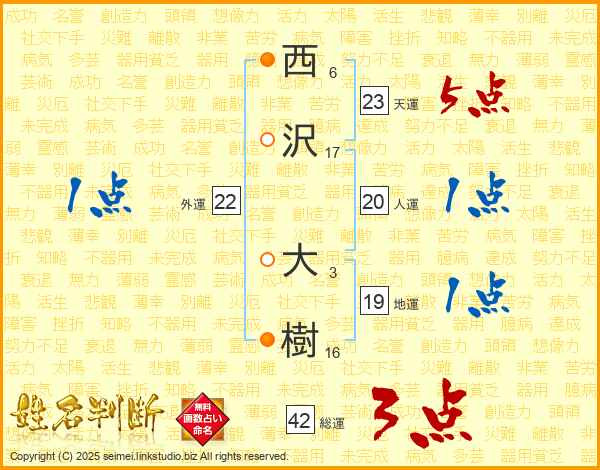 生活面を象徴する運勢です。外部から受ける影響力を表し、結婚運、家庭運や職場、環境への順応性を表します。総運から人運を引いた画数。姓や名が1文字の場合を除く。