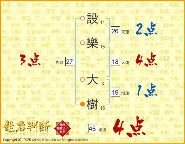 設樂大樹さんの総運は45画の4点!