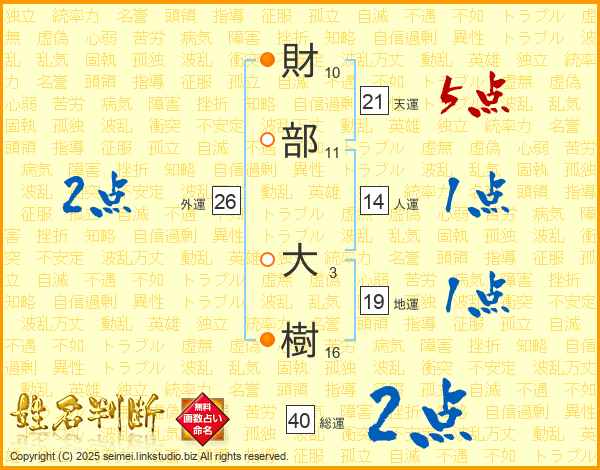 生活面を象徴する運勢です。外部から受ける影響力を表し、結婚運、家庭運や職場、環境への順応性を表します。総運から人運を引いた画数。姓や名が1文字の場合を除く。