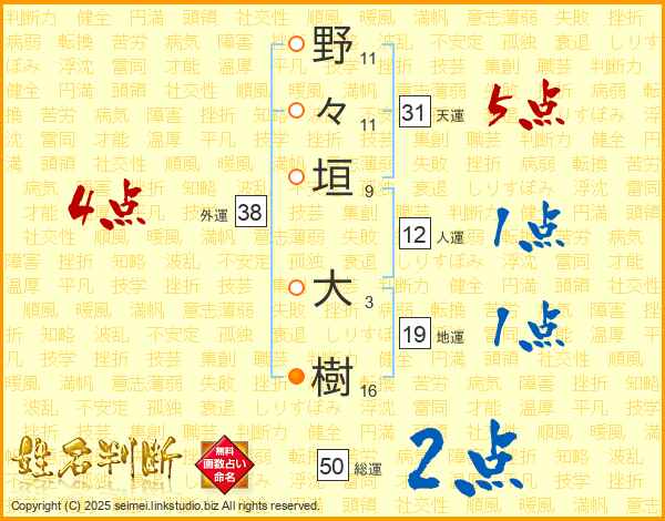 野(11画)々(11画)垣(9画) 大(3画)樹(16画)