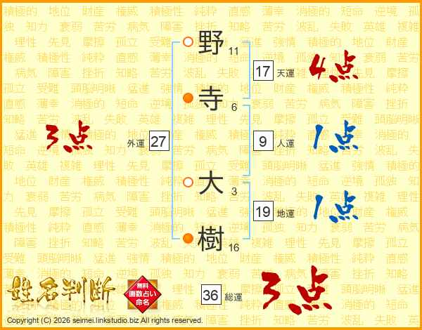 生活面を象徴する運勢です。外部から受ける影響力を表し、結婚運、家庭運や職場、環境への順応性を表します。総運から人運を引いた画数。姓や名が1文字の場合を除く。